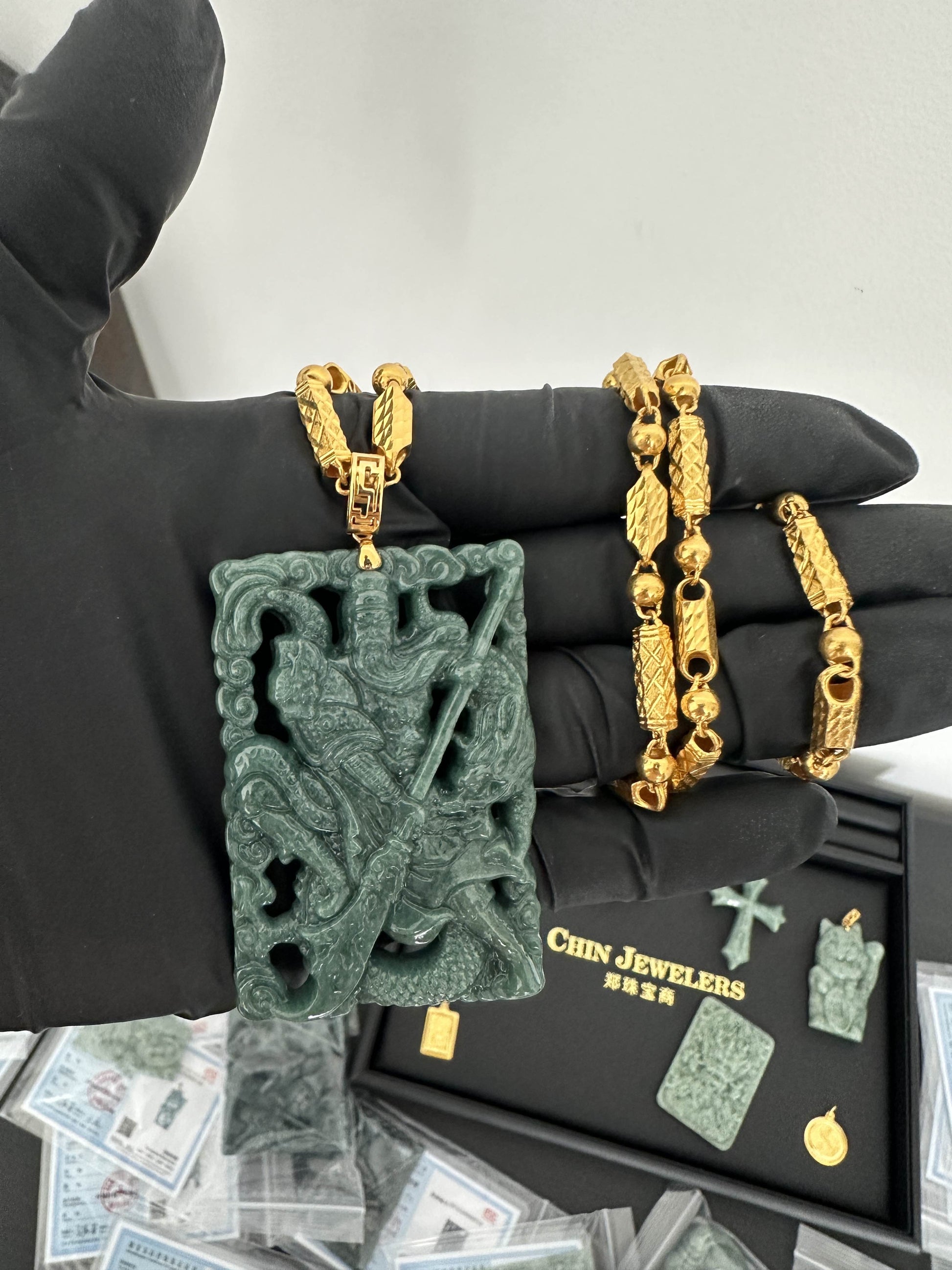 This jadeite Guang Gong pendant represents loyalty, righteousness, and protection, honoring the legendary Chinese general revered as a guardian against evil. In Chinese culture, Guang Gong is believed to bring courage, justice, and success in business and life. Finely carved from jadeite, this pendant is a powerful symbol of strength and integrity, offered for sale as both a spiritual talisman and collectible piece.